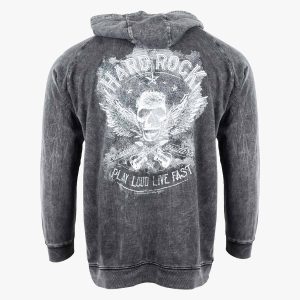 Guitar Company Pullover with Skull Design in Vintage Black PLAY LOUD. LIVE FAST! Stand out from the crowd in this pull over hoodie. Featurs an innovative mineral wash that showcases a one-of-a kind skull graphic on the back that says, "Play Loud. Live Fast"! You will love its soft vintage screen print graphic, offering a…