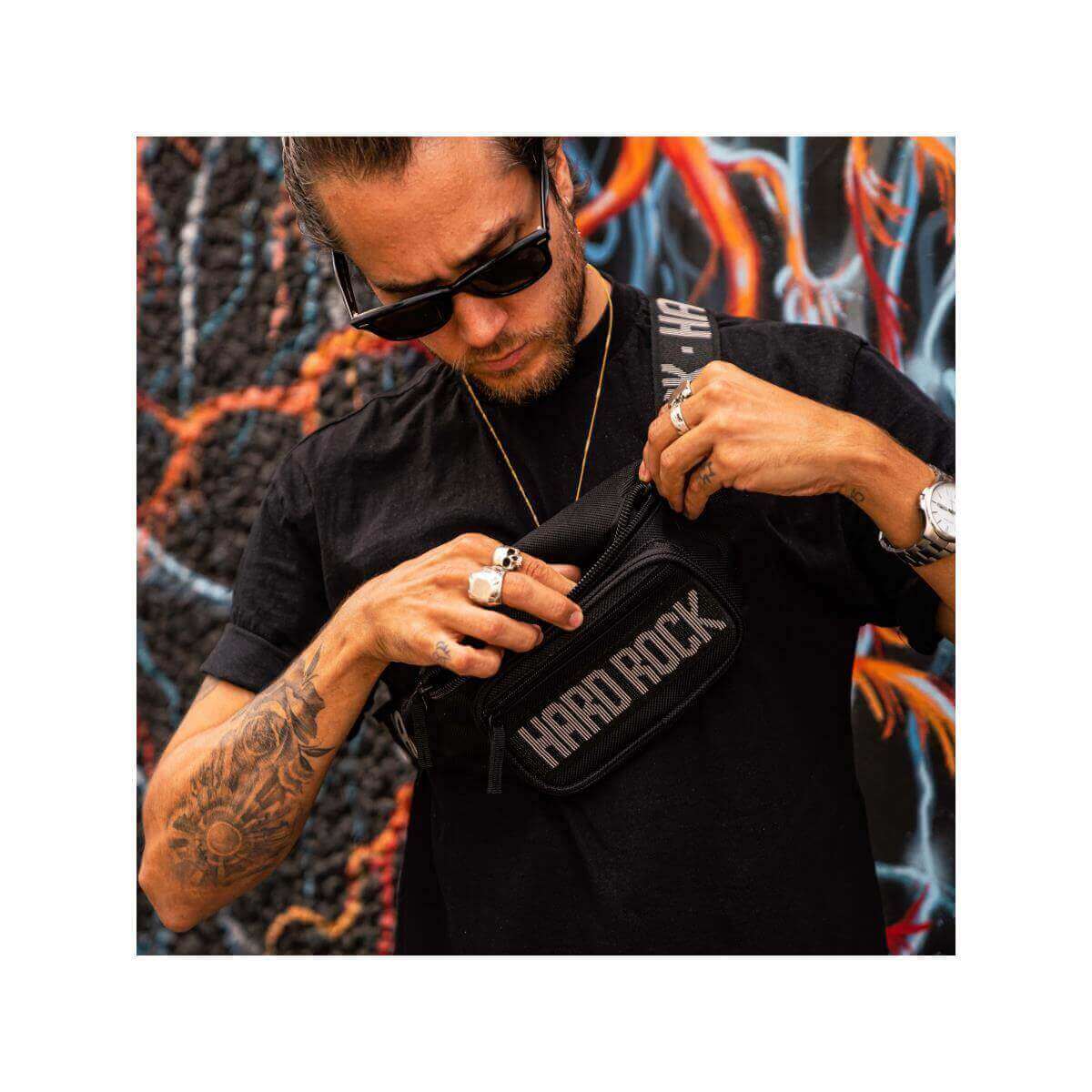 Active Waist Pack The perfect pack for when youíre on the go. Strap this Hard Rock Active Waist Pack around your hips next time youíre traveling to a concert, festival, amusement park or anywhere else you want to enjoy the convenience of hands-free storage. Part of our Hard Rock Activewear collection, this black waist pack pairs perfectly with any outfit and it will easily fit a multitude of sizes. The waist bag features a front webbing strip with Hard Rock logo, also found on the clip-on strap, with three separate zip closures for fitting a variety of small to medium sized items.