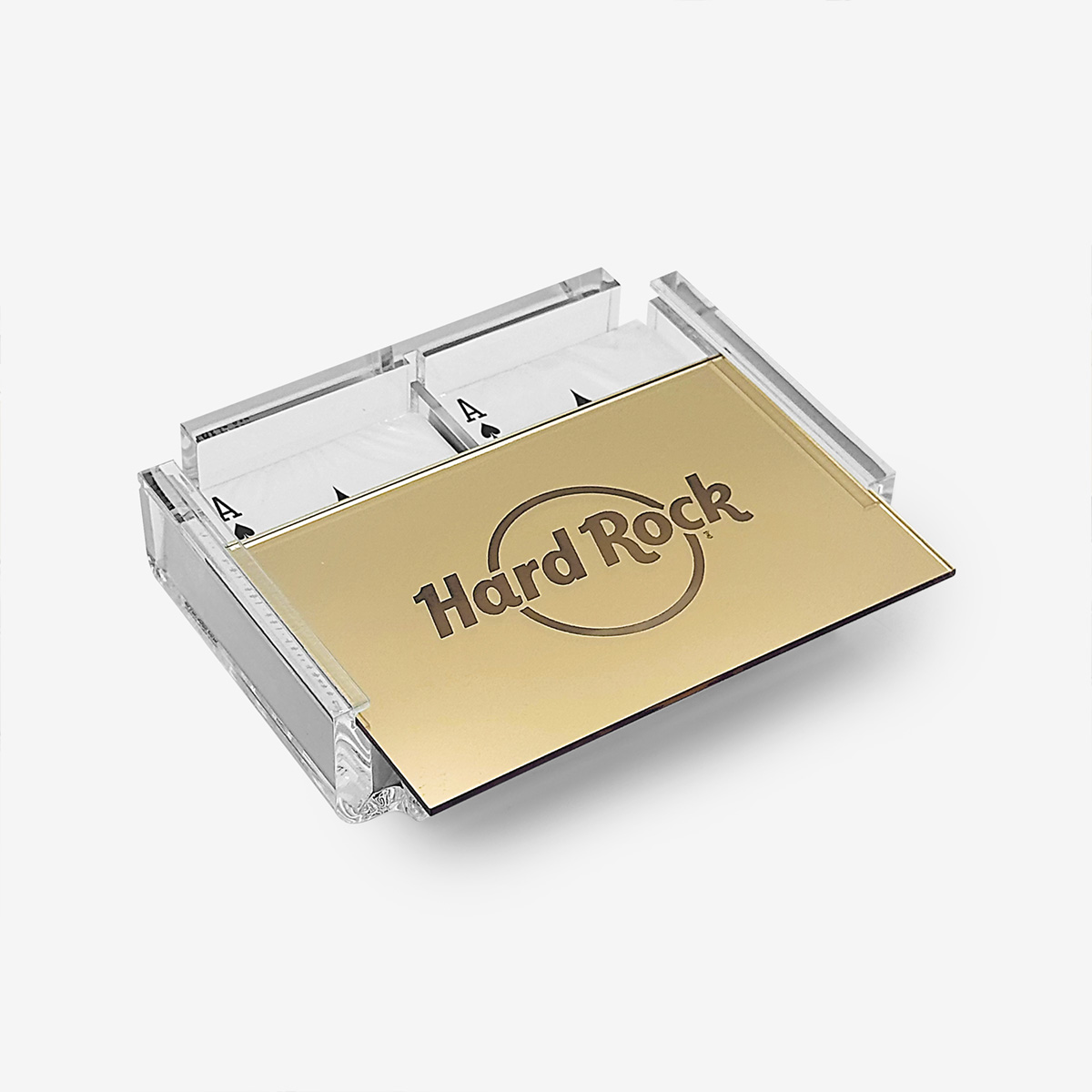 Hard Rock Double Card Deck in Golden Mirror High stakes meet high style. The Luxe Dominoes x Hard Rock Double Card Deck in Golden Mirror is built like a jackpot—sleek, compact, and impossible to ignore. Sealed inside a flame-polished acrylic case and crowned with a gold mirror lid, it’s a bold invitation to shuffle, deal, and dominate the table.